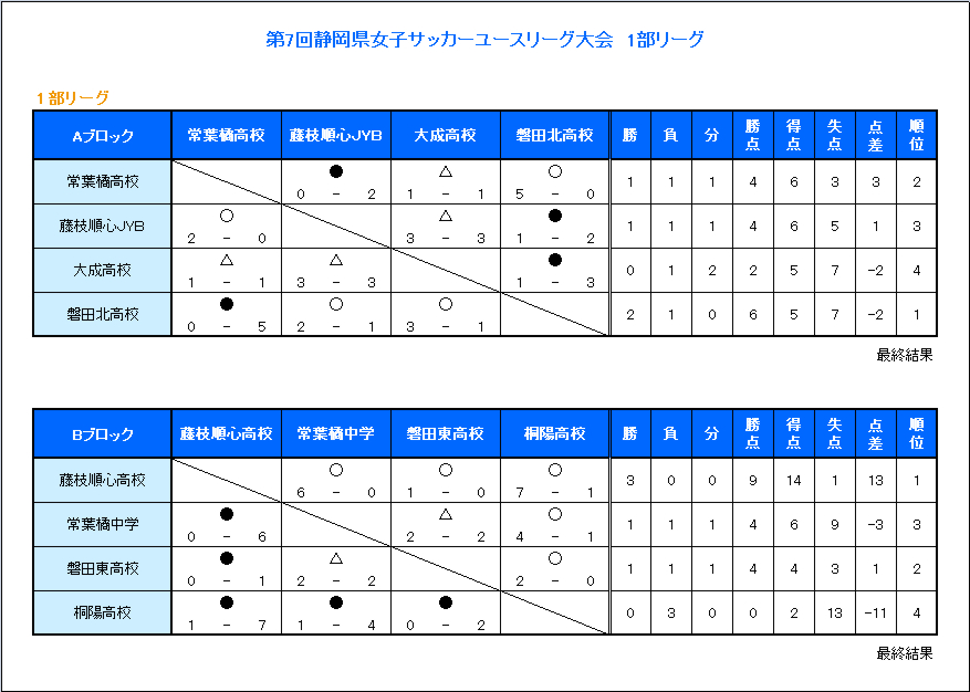 1部Aブロック:常葉橘高校、藤枝順心JYB、静岡大成高校、磐田北高校